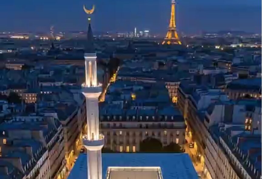 La mosquée, avec son design contemporain, ses façades blanches et ses motifs géométriques, s’impose avec force au milieu des immeubles haussmanniens en pierre de taille, symboles de l’histoire et de l’identité parisiennes.