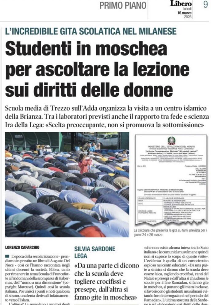 Le quotidien Libero a titré en une : « Incroyable sortie scolaire dans la région de Milan : des élèves à la mosquée pour une leçon sur les droits des femmes ». Il a publié également une photo choquante : des dizaines d’enfants italiens allongés sur des tapis de prière, prosternés comme des musulmans, avec la mosquée et la circulaire officielle de l’école en arrière-plan. Voici le tweet de Francesca Totolo qui a déclenché le scandale :