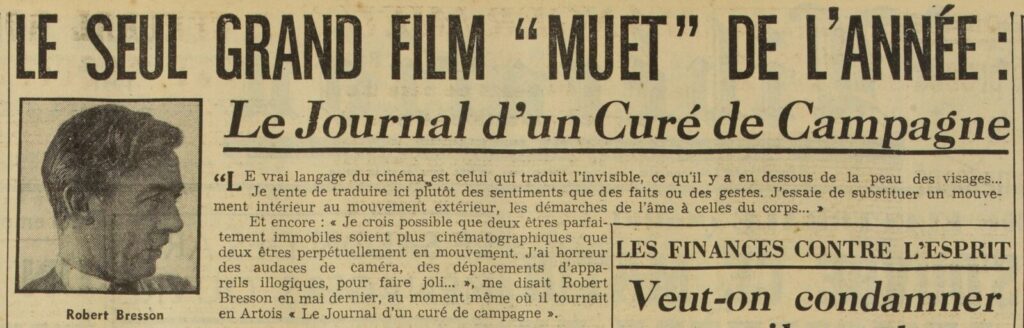 A propos du » Journal … » ; Bresson dit : « Les larmes du saint curé d’Ambricourt sont dues autant à un excès de pitié envers l’espèce humaine qu’à la nostalgie d’un monde révélé qui, continuellement, lui échappe. ». A propos du cinéma : « l’action dans un film doit être et sera de plus en plus intérieure. ». Il regrette que la plus souvent le mouvement au cinéma, ne soit que de l’agitation… Il dit aussi : « Le silence est la grande découverte du cinéma sonore.»