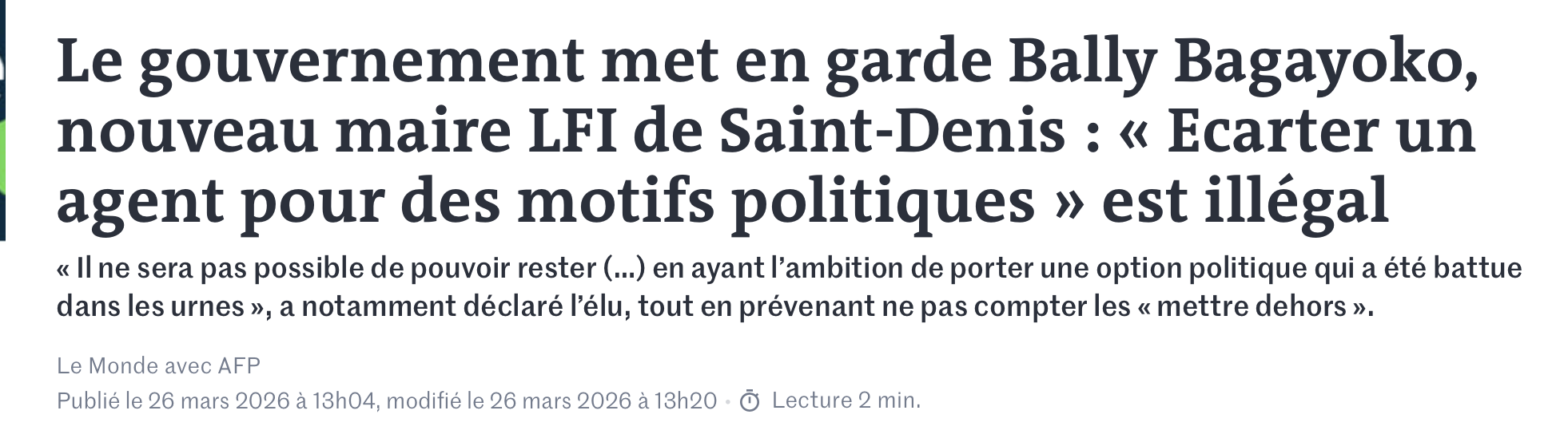 Même la Macronie a été obligée de lui rappeler que, pour l’heure, même Saint-Denis et sa majesté Bally Bagayoko étaient obligés d’admettre que les salariés de la Mairie, policiers y compris ne sont pas obligés de penser comme lui et de faire partie de LFI !