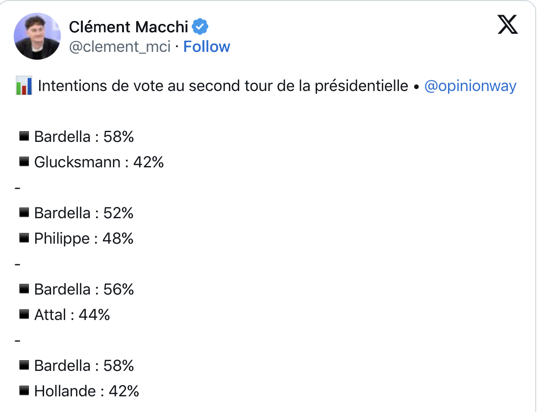C’est certes infiniment mieux que si c’était Mélenchon et un peu mieux que si c’était Marine ou les macronistes qui ne veulent pas l’avouer Edouard Philippe, Darmanin… et je ne parlerai pas du cauchemar impensable Hollande… mais en tout cas je sais, tu sais, il sait nous savons tous, à Résistance républicaine que le gentil, bien élevé, qui a peur de tout Bardella n’a pas le niveau ni les couilles nécessaires pour sortir la France de la très profonde ornière où elle se trouve.