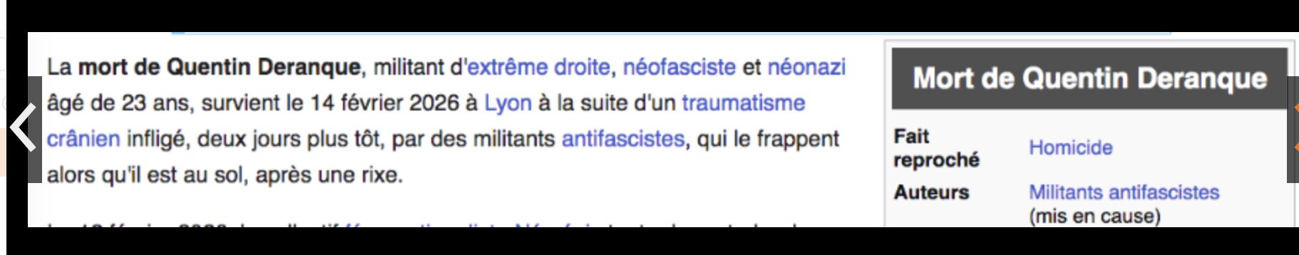 -(2) Lien sur l’ignominie de Wikipedia concernant les qualifications politiques attribuées à Quentin Deranque, massacré mortellement par des militants de la Jeune Garde… Un mouvement proche du député LFI Raphaël Archenault que l’Assemblée Nationale accepte sous un… pseudonyme ! Celui de… Raphaël Arnault !
