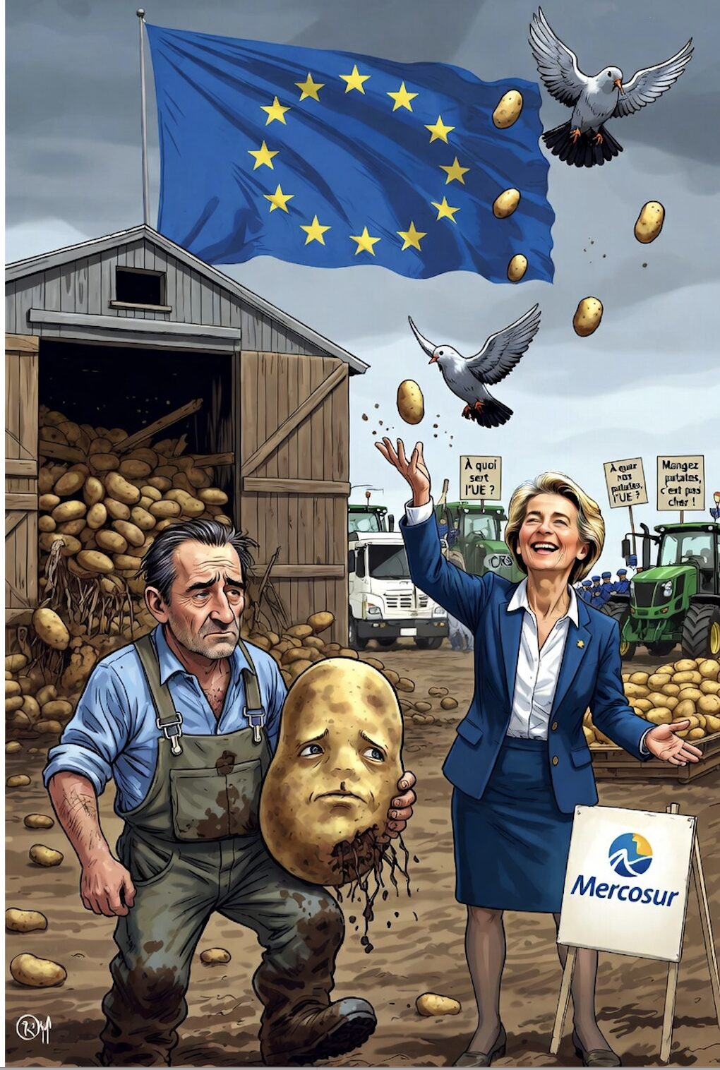 Euh ! A quoi elle sert l’Europe, pardon, l’UE ? Non seulement à faire une concurrence déloyale à nos paysans avec le Mercosur et même à présent avec des productions venant d‘Amérique latine, d’Inde, d’Australie... mais à submerger notre continent de patates… A quoi servent les régulateurs, les prévisions, les négociations entre branches et entre paysans ???