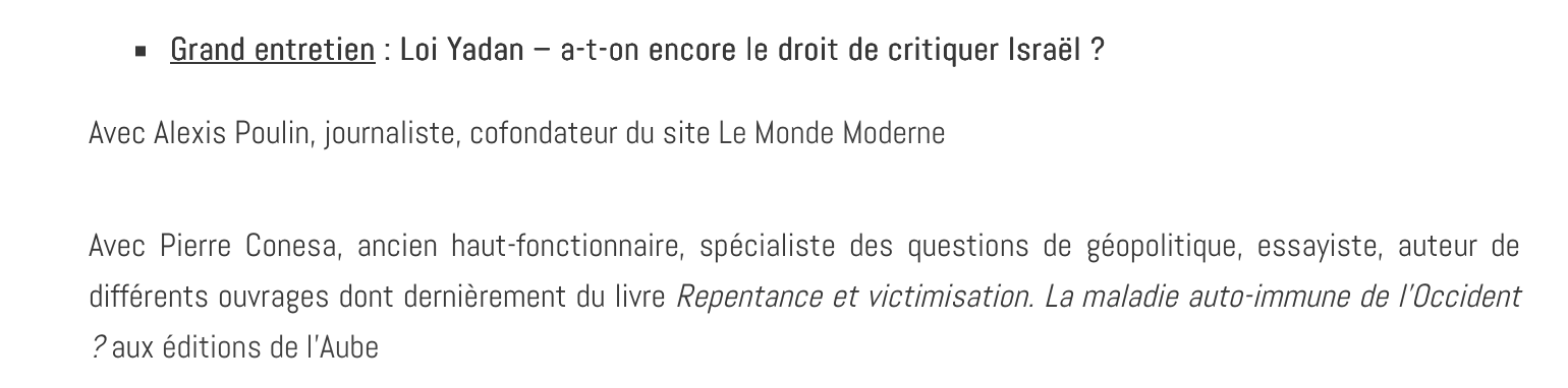 Certes, vous bénéficiez de contributions par d’intéressants intervenants, notamment Pierre Yves Rougeyron qui en privé a exprimé des prises de position tellement pro-israéliennes qu’elles feraient pâlir des Israéliens de droite, mais sur votre antenne, il joue une tout autre partition.