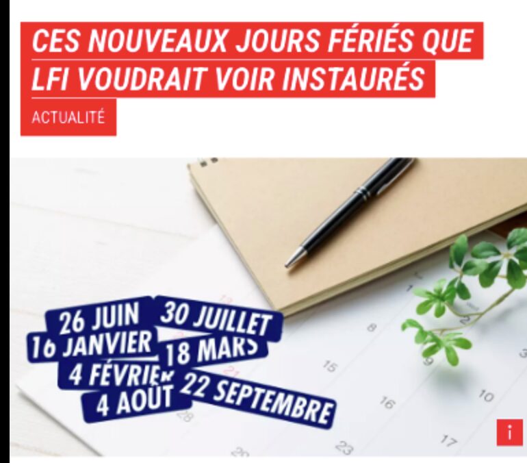 Eh, LFI ! Pour votre idée, quelque peu saugrenue, de modification des congés de notre calendrier grégorien, pour quelles raisons ne choisissez-vous pas le calendrier de l’Algérie avec ses jours fériés rappelant tant -ce que vous chérissez- la haine qu’ils ont de nous ?