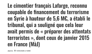 Ce n’est pas juste, tout simplement. C’est même ignoble pour deux raisons : faire payer à Lafarge la lâcheté des politiques et avoir permis ainsi que des entreprises françaises aient financé Daech, fût-ce pour sauver des emplois ! On rappellera tout de même et il ne faudra jamais l’oublier que si le tribunal correctionnel de Paris a reconnu le cimentier coupable de financement du terrorisme (paiements de 5,6 millions d’euros sur un total estimé entre 4,8 et 10 millionsà des groupes djihadistes, dont l’État islamique, pour maintenir l’usine de Jalabiya en Syrie en 2013-2014) la note DGSE du 26 août 2014, révélée il y a des années par *Libération*, prouve que l’État français était au courant de cet accord tarifé avec Daech !