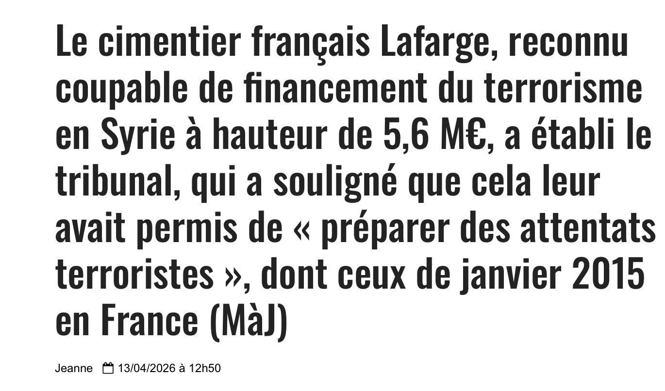 Le tribunal correctionnel de Paris a donc reconnu le cimentier Lafarge coupable de financement du terrorisme : paiements avérés de 5,6 millions d’euros (sur un total estimé entre 4,8 et 10 millions) à des groupes djihadistes, dont l’État islamique, pour maintenir l’usine de Jalabiya en Syrie en 2013-2014.