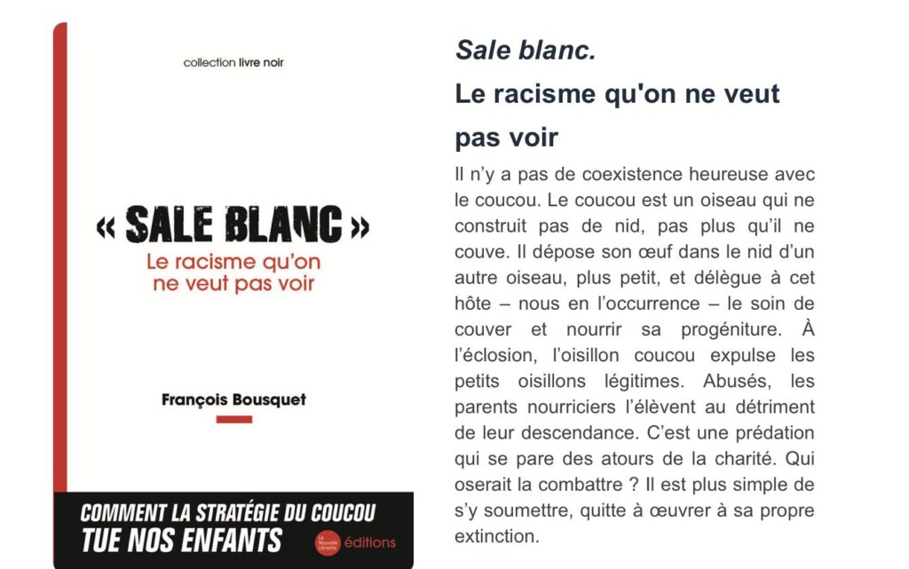 A l’heure où de grossières et opportunistes tentatives de récupération politicienne se font entendre, l’ouvrage «Sale Blanc ! » vient, témoignages et chiffres à l’appui, rendre compte d’une réalité méconnue et volontairement dissimulée par les gouvernements de droite comme de gauche.