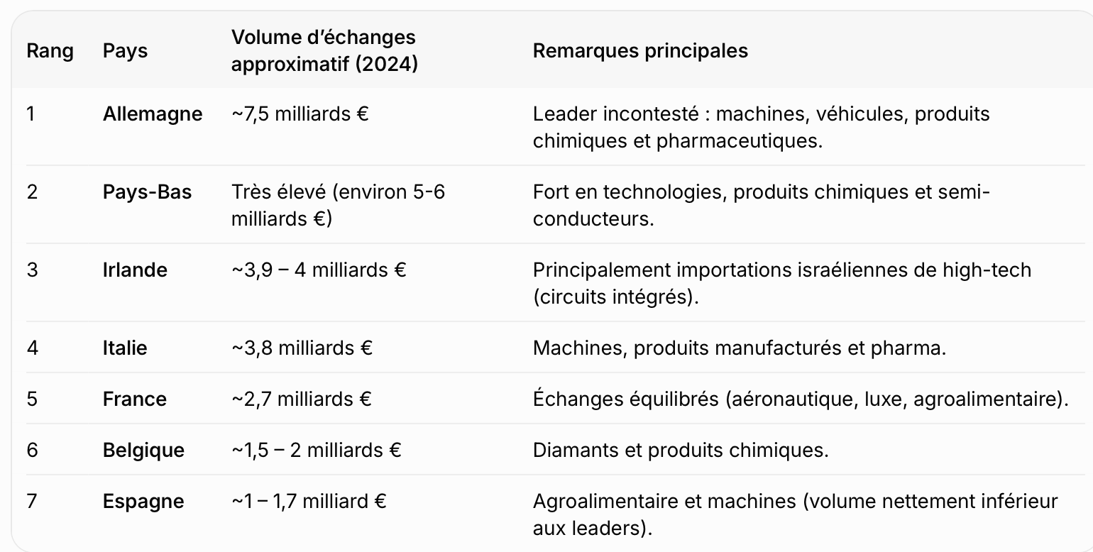 Ci-dessous les principaux pays européens qui commercent le plus avec Israël en 2024 (volumes d’échanges totaux import + export) :