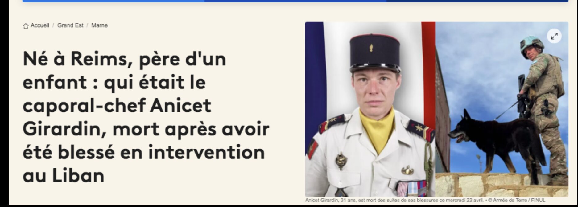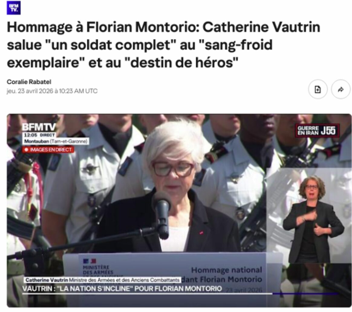 Jeudi, donc, comme pour le premier soldat, Il s’est contenté d’y envoyer, non au minimum le Premier Ministre Sébastien Lecornu, mais Il a préféré le Ministre des Armées Catherine Vautrin… Peut-être parce qu’elle avait si bien fait le boulot pour la cérémonie précédente ! Et je crains que, toute honte bue, il ne demande à ce Ministre qui, contrairement à lui, marche au pas du moins politiquement, de présider l’hommage au troisième militaire français « Mort pour la France » lors de ce théâtre de guerre de 2026 au Proche-Orient : le caporal-chef Anicet Girardin du 132e Régiment d’Infanterie Cynotechnique (1) de Suippes, dans la Marne.