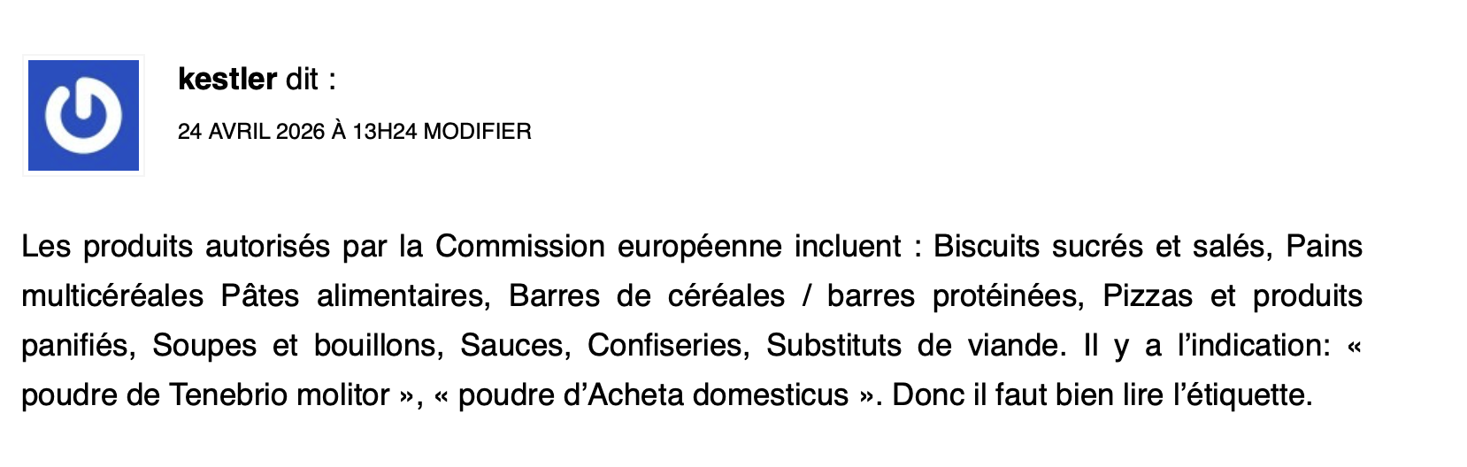 Je me pose alors cette question : est-ce que le bio accepte les protéines d’insectes ? Si non peut-être que choisir systématiquement du bio sur certains produits pour éviter cette immonde saloperie serait un début de réponse malgré le prix ?