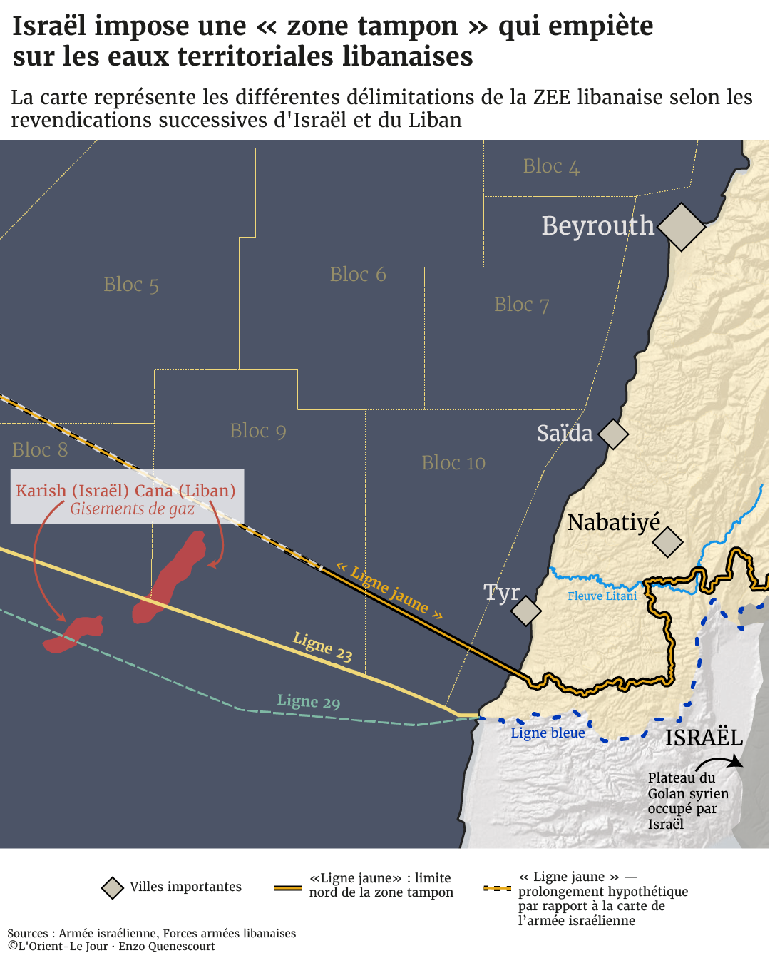 Conclu en octobre 2022 sous médiation américaine, l’accord avait fixé la ligne 23 comme frontière entre les Zones économiques exclusives (ZEE) respectives du Liban et d’Israël. Il avait permis de trancher le différend autour des champs gaziers de Karish et de Cana, ouvrant la voie à l’exploitation par Israël du premier et reconnaissant au Liban des droits sur le second, qui traverse les blocs 9 (libanais) et (72) israélien.