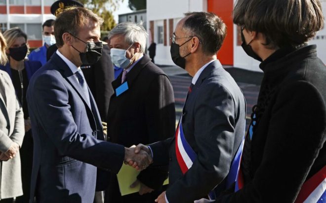 French President Emmanuel Macron (L) shakes hands with Mayor of Beziers Robert Menard (2ndR) as he arrives to visit Genvia’s company in Beziers, southern France, on November 16, 2021. – Genvia is a Clean Hydrogen Technology Venture created to enable individual organisations, industries and nations to meet their goals for decarbonization by accelerating affordable clean hydrogen production, energy storage and fuel applications at scale, according to its official website. (Photo by Guillaume HORCAJUELO / POOL / AFP)