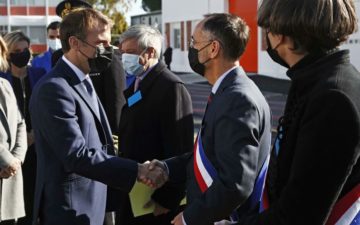 French President Emmanuel Macron (L) shakes hands with Mayor of Beziers Robert Menard (2ndR) as he arrives to visit Genvia’s company in Beziers, southern France, on November 16, 2021. – Genvia is a Clean Hydrogen Technology Venture created to enable individual organisations, industries and nations to meet their goals for decarbonization by accelerating affordable clean hydrogen production, energy storage and fuel applications at scale, according to its official website. (Photo by Guillaume HORCAJUELO / POOL / AFP)